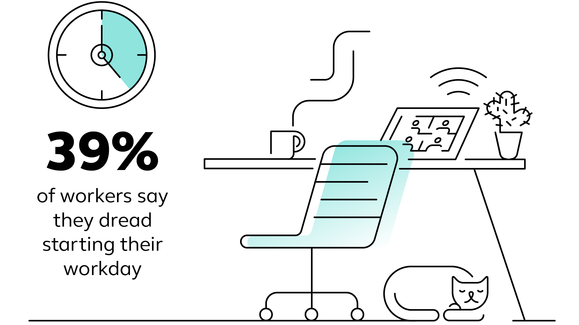 However, the overall positive feeling doesn’t necessarily translate into the day-to-day. 39% of workers say they dread starting their workday, compared to 23% in 2020.