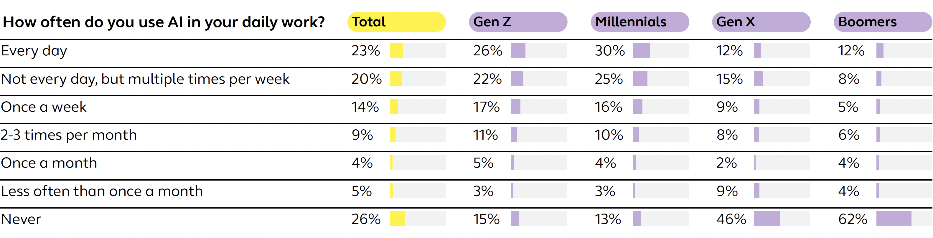However, AI usage varies significantly across generations. Millennials and Gen Z are much more likely to use AI at work, with only 15% and 13%, respectively, saying they never use it. By contrast, 62% of Baby Boomers report never using AI at work. Bringing employees along on your AI journey may require a different approach for older workers to help them become more comfortable.