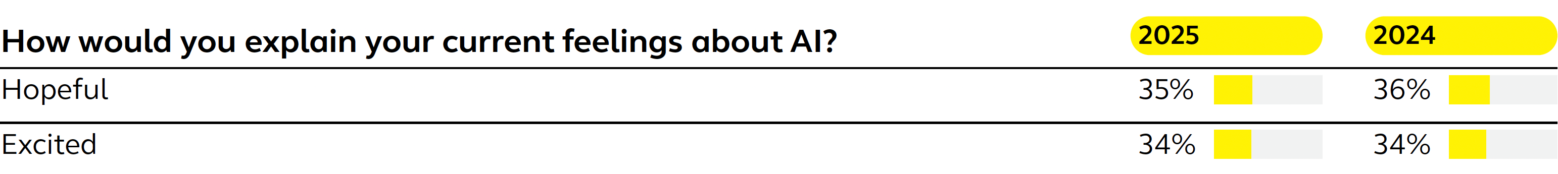 When asked for their current feelings about AI, employees’ top two answers continue to be positive — hopeful (36%) and excited (34%). We see that same optimism shine through when employees are asked if they trust AI to make good recommendations, with 43% agreeing compared to only 36% in 2024. And people are less skeptical of the output, with only 42% in that camp.