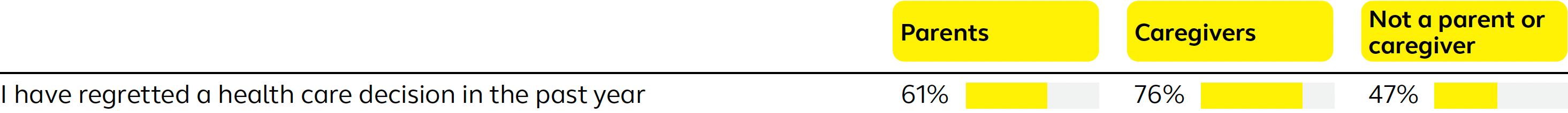 Notably, parents (61%) and caregivers (76%) are far more likely to regret a healthcare decision than non-parents or caregivers (47%). While Mindset data doesn’t delve into why this is the case, it’s relatively easy to deduce. These individuals are responsible not only for themselves, but also for the children and/or adults in their care, so they probably make more healthcare decisions in a month than most people make in a year. The likelihood of regretting one (or more) is higher because of the sheer volume of decisions being made.